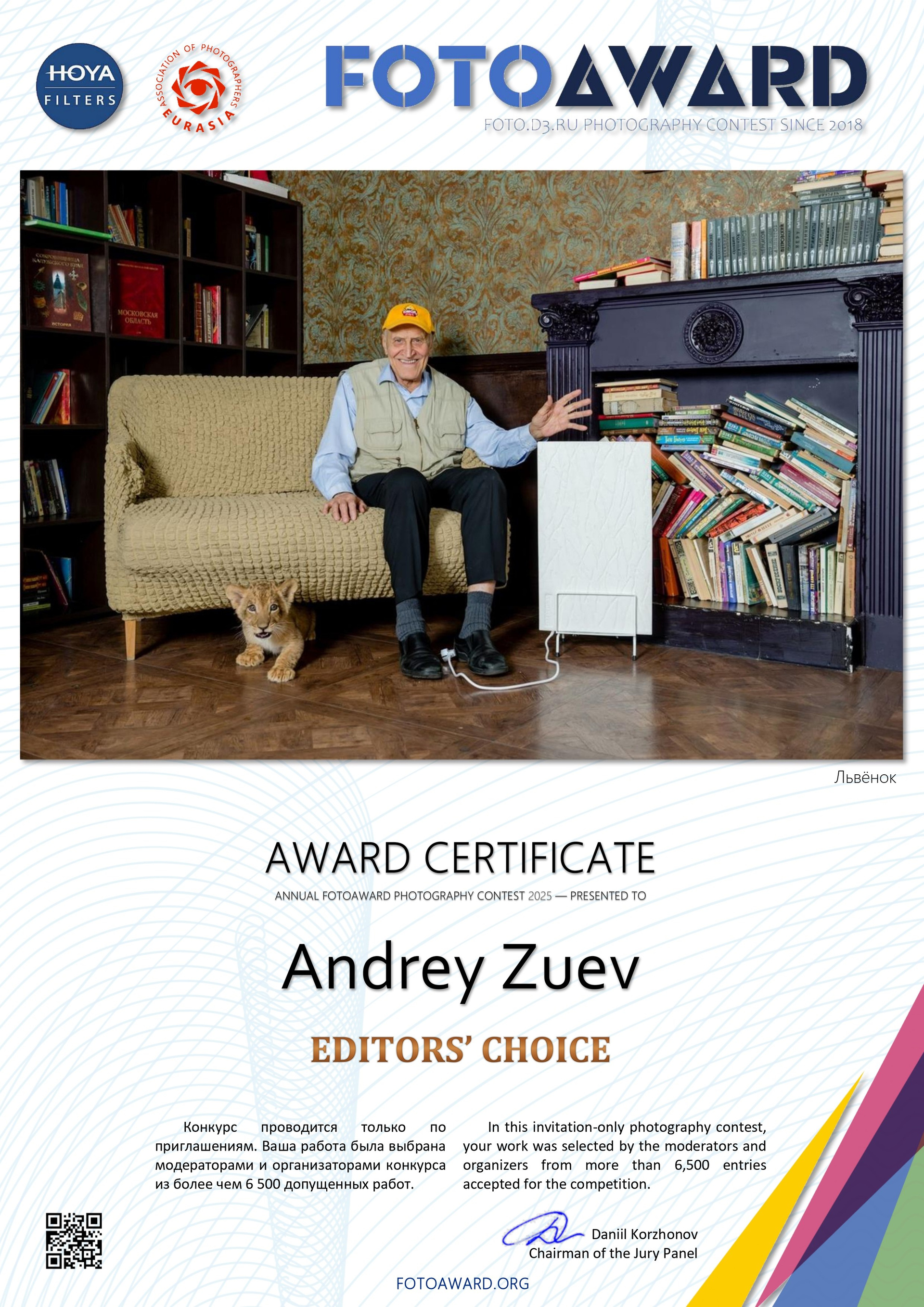 Андрей Зуев — репортажный фотограф, фотожурналист, свадебный фотограф, член Союза фотографов дикой природы. Имеет награды зарубежных международных фотоконкурсов в разных номинациях, Участник крупнейшей в Европе выставки фотографий дикой природы «Первозданная Россия». В круге общения ведущие фотографы из разных стран мира. Иностранные языки: испанский на разговорном уровне.